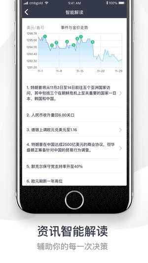 “招银汇金”智能交易App是由招商银行面向个人客户推出的一款致力于打造高端新闻资讯,深度挖掘业内信息,智能解读资讯内容的媒体平台,以及含贵金属、外汇、大宗商品及衍生产品的智能交易平台。